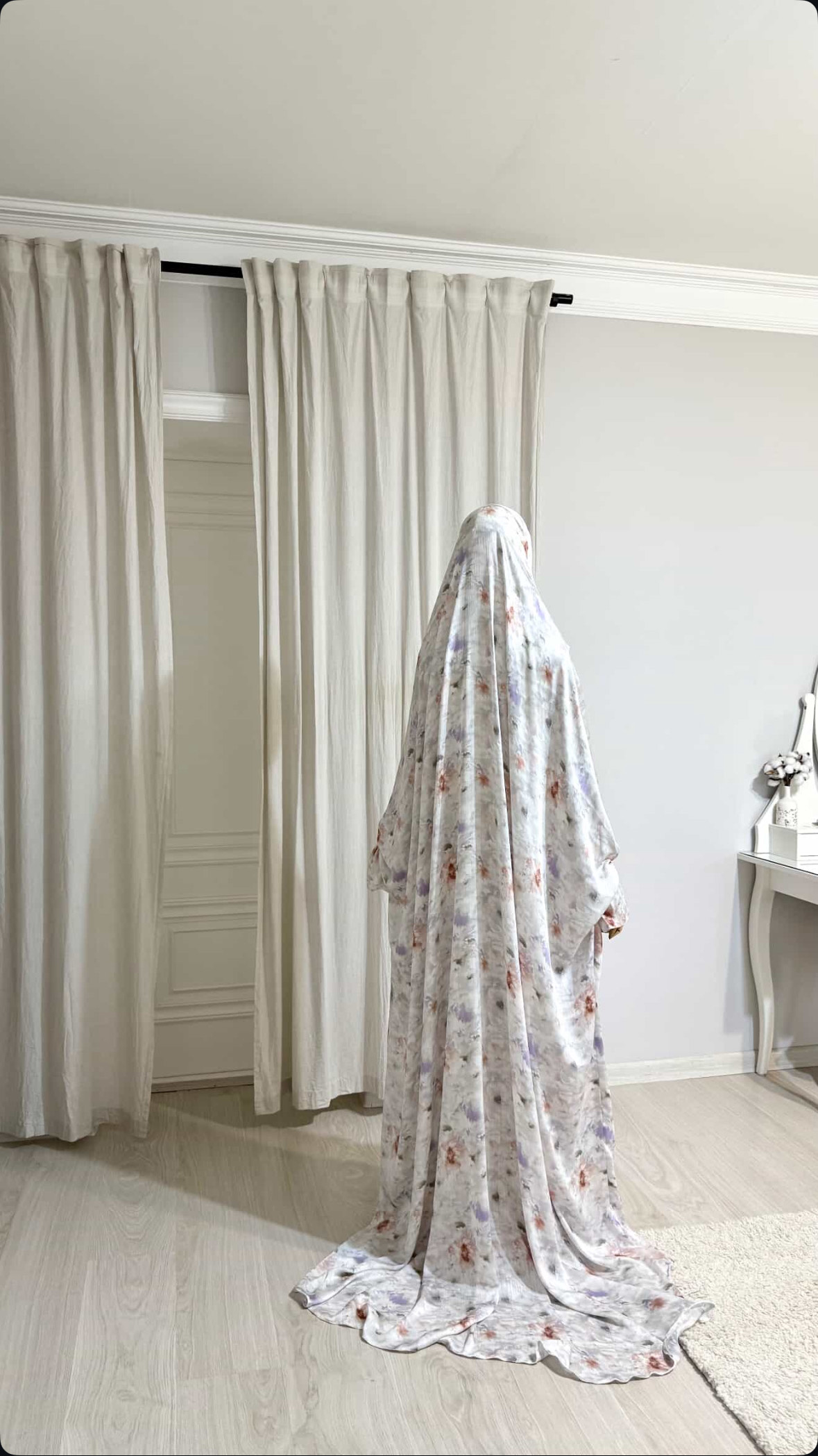 Avec ses dimensions généreuses (180 x 85 cm), il assure une couvrance optimale et une aisance totale dans vos mouvements. Sa coupe raffinée et sa matière noble en font une tenue à la fois pratique et élégante, idéale pour vos instants spirituels mais aussi lorsqu’il vous arrive d’accueillir des invitées féminines.