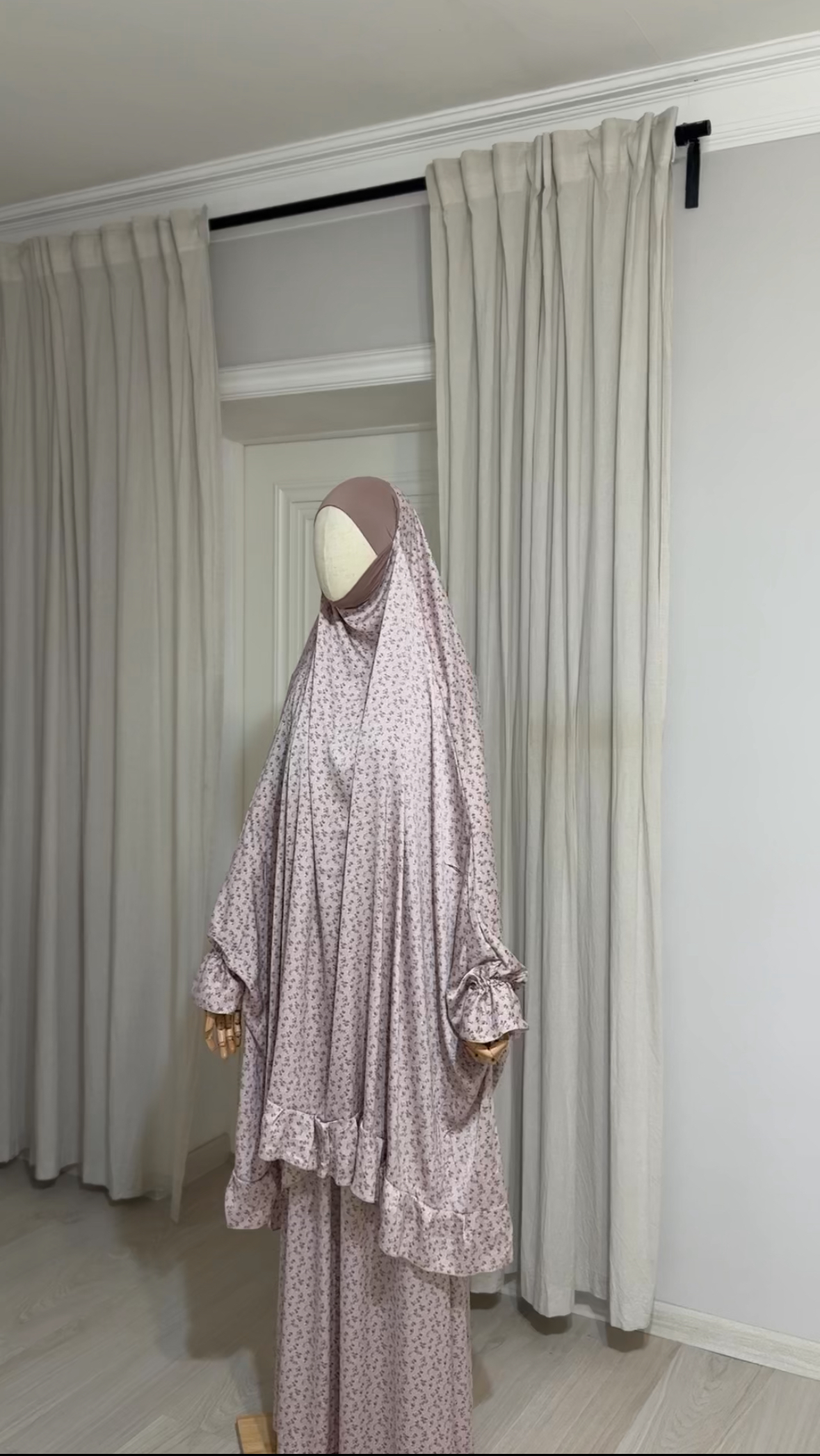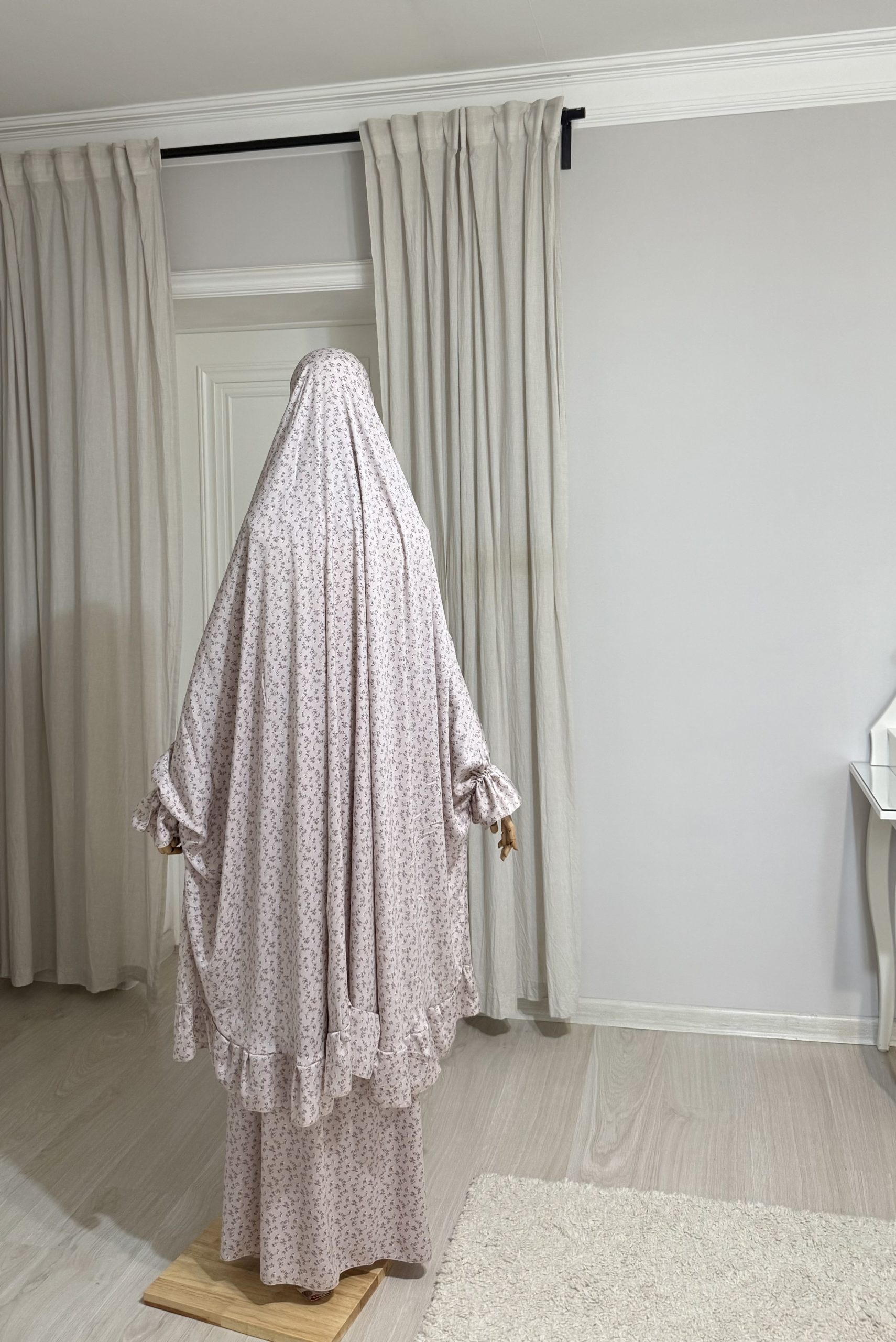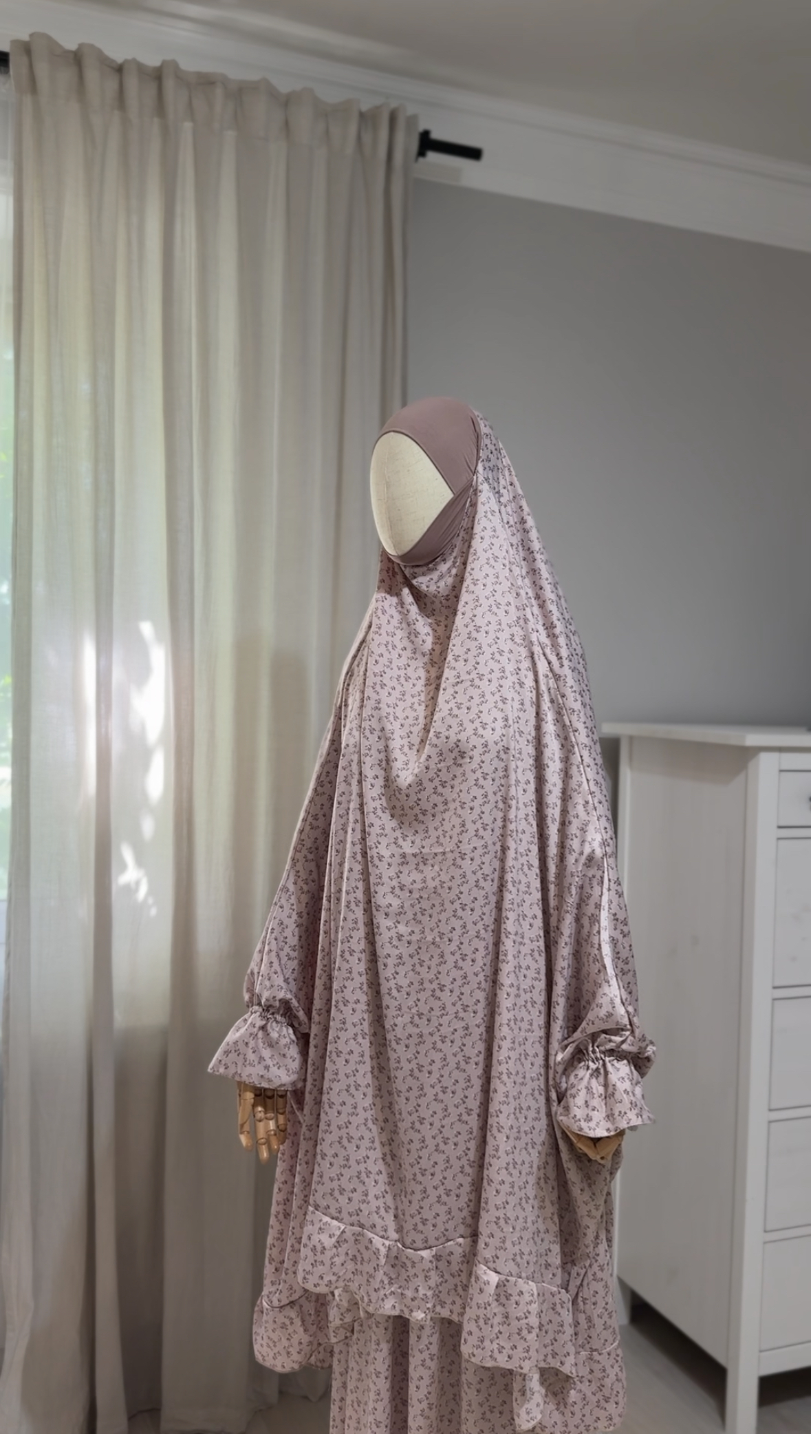 Ce jilbeb deux pièces est pensé pour sublimer vos moments de recueillement, vous permettant de vous parer avec raffinement pour votre Créateur, tout en restant pratique et élégant lorsque vous recevez des invitées.